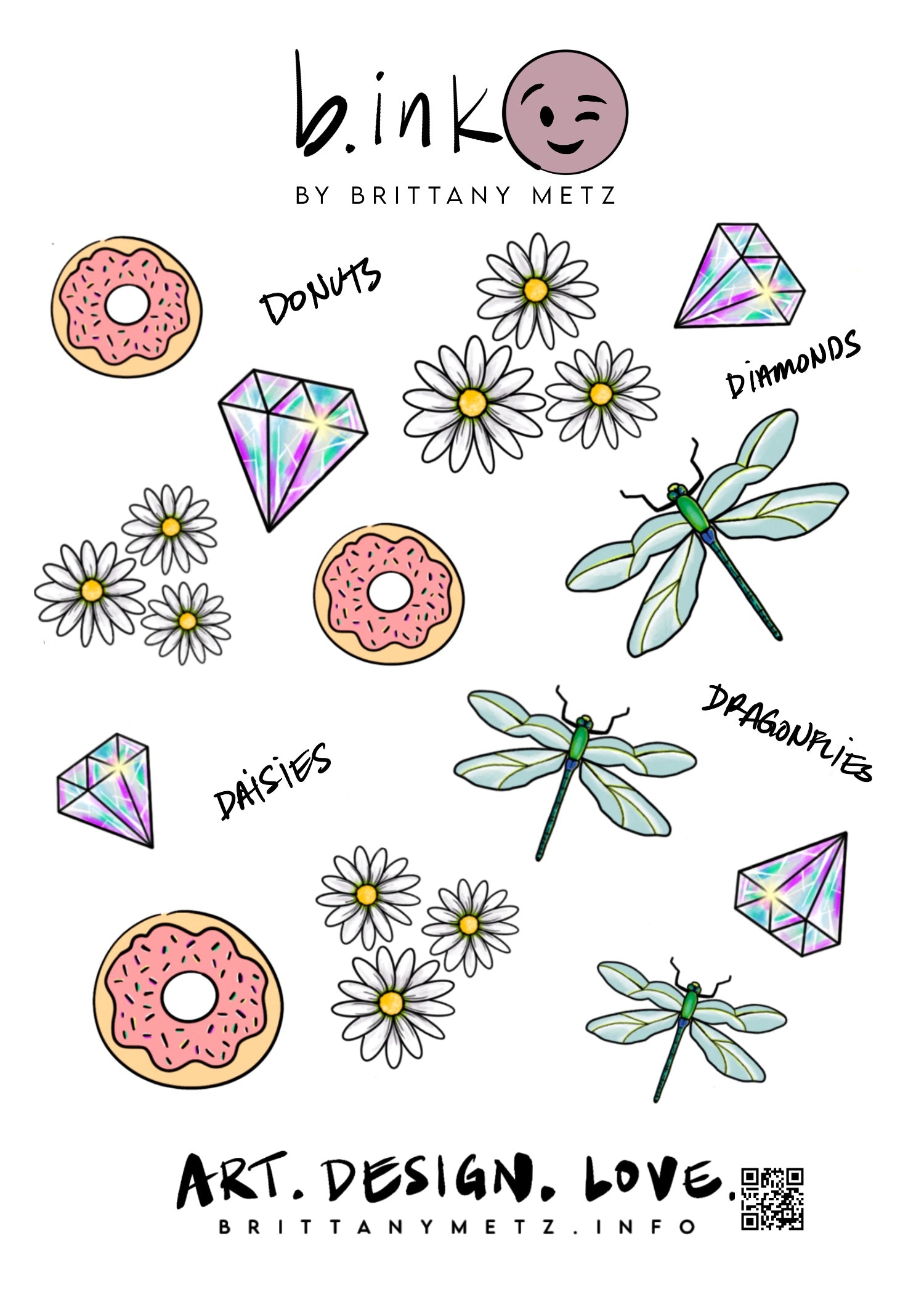 Hand-illustrated Matte Sticker Sheet with 14 stickers per sheet, all starting with the letter "D" - Daisies/Dragonflies/Donuts/Diamonds