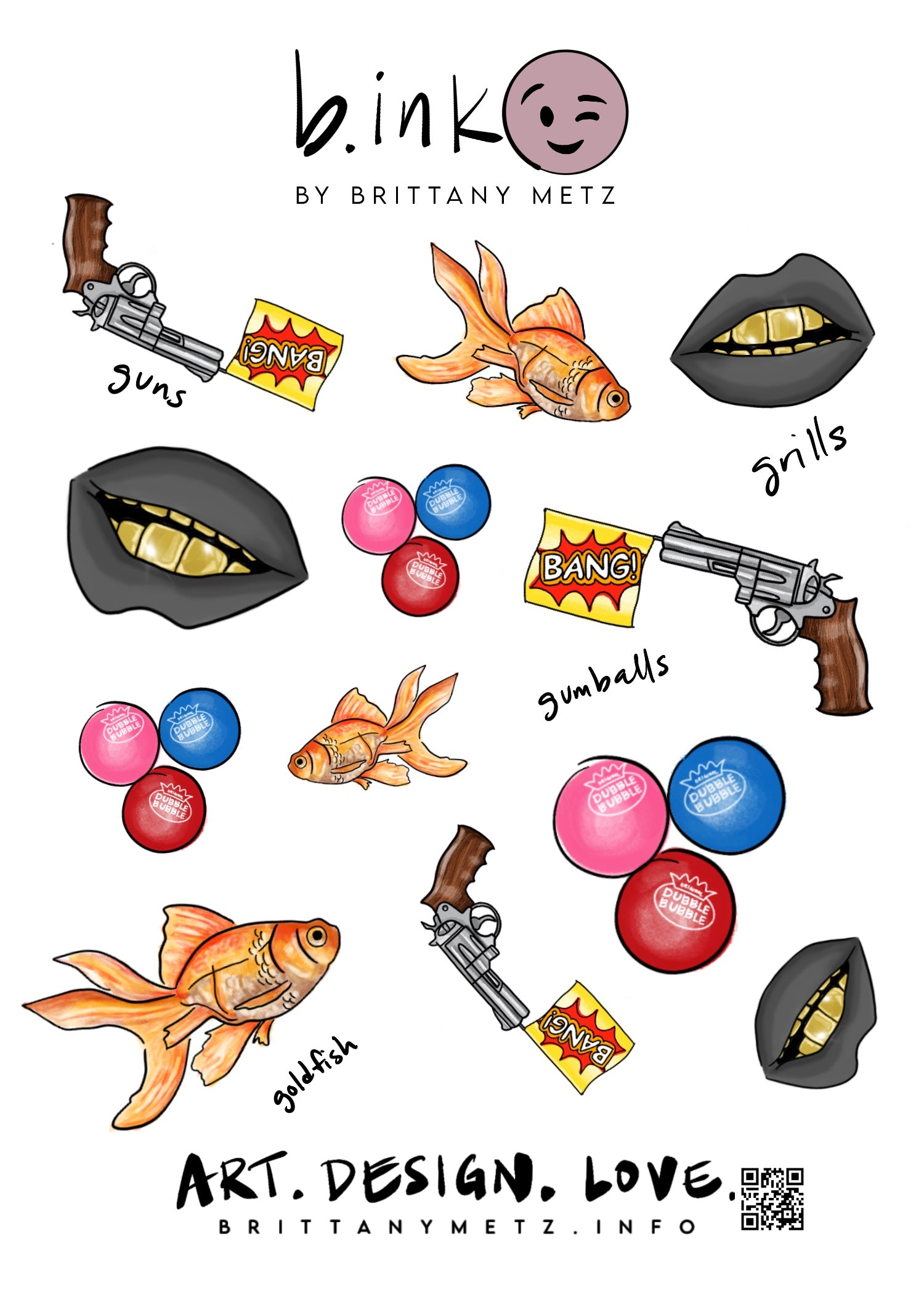 Hand-illustrated Matte Sticker Sheet with 12 stickers per sheet all starting with the letter "G" - Goldfish/Gumballs/Grillz/Gunz