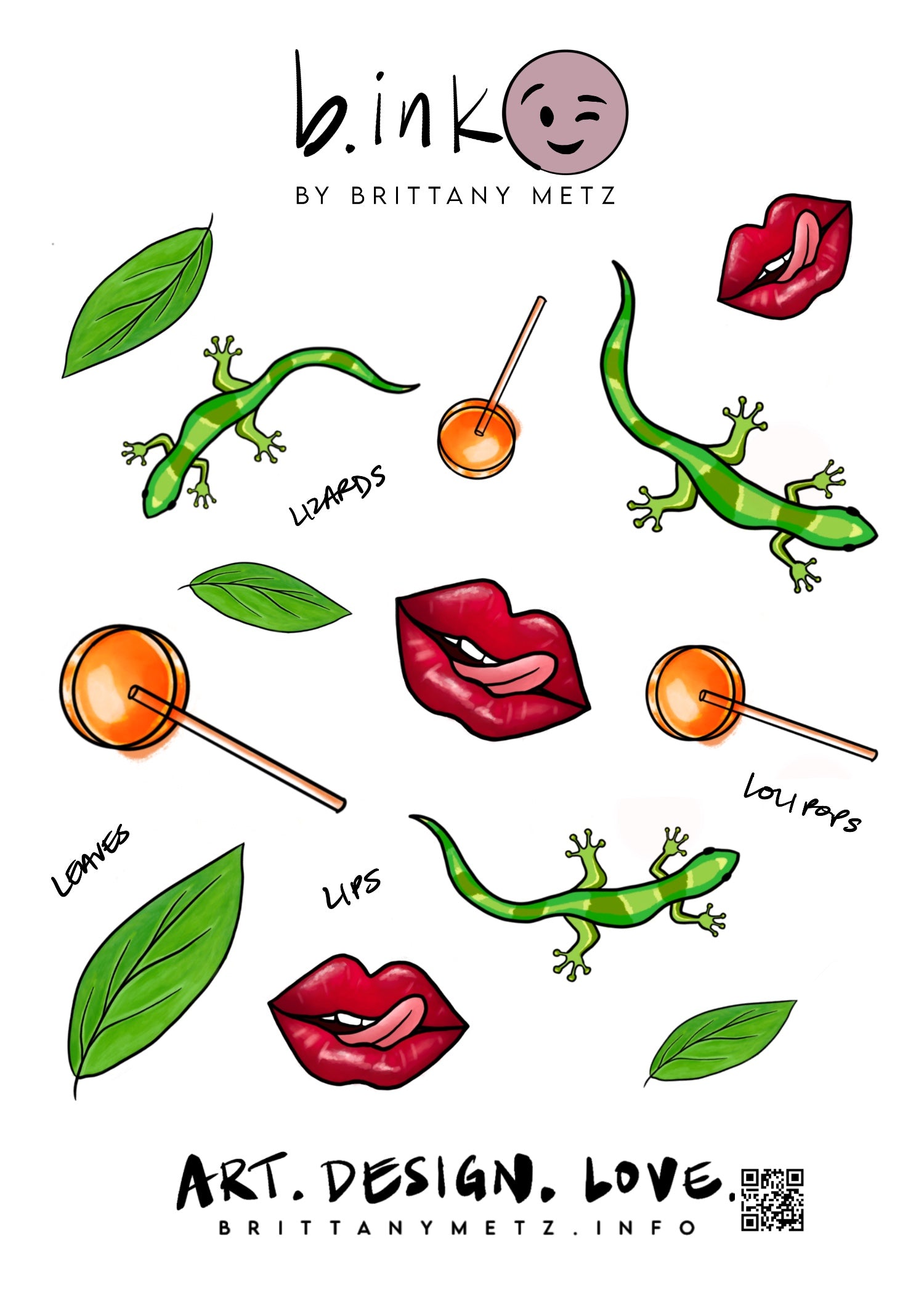 "L" Sticker Pack- Lips/Lizards/Leaves/Lollipops